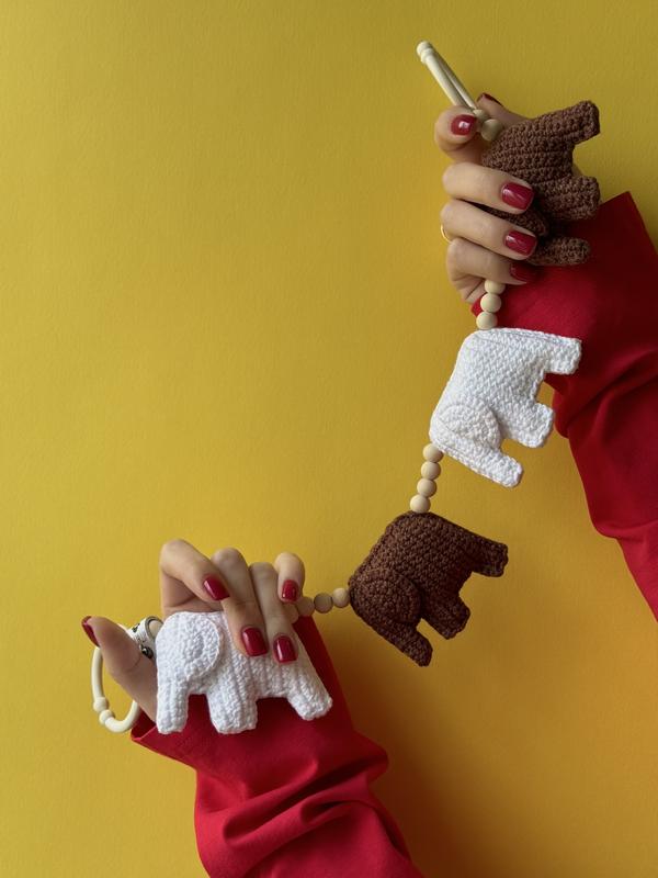 • стимулирует развитие зрения и прикосновения • развивает способность малыша концентрировать внимание • натуральные деревянные бусины • слонечки из гипоаллергенной пряжи • ручная работа