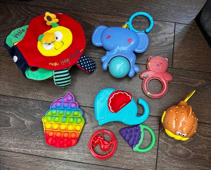 Детские игрушечки. Мягкая книжечка, погремушки, попит, и грызуны.