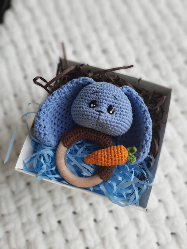 Погремушка-прорезыватель ручной работы с гипоаллергенной пряжи зайчик с морковью в подароч...