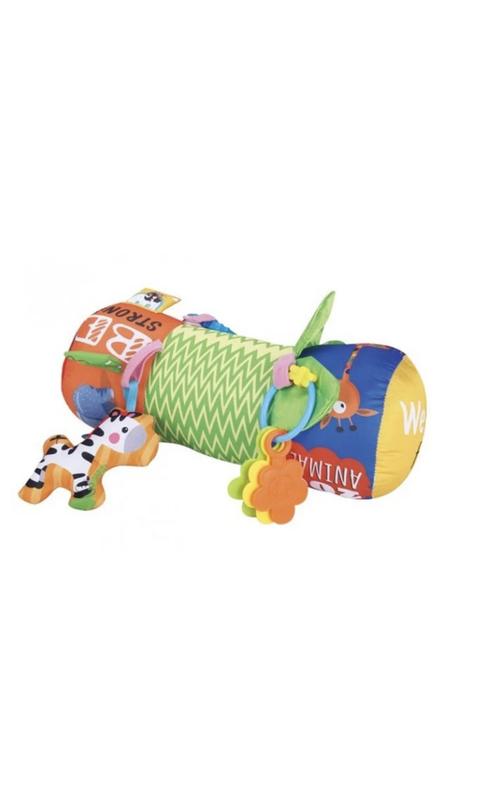 Яскрава подушка-циліндр з брязкальцями. Основною метою брязкальця є розвиток у немовляти органів чуття. Брязкальце розвиває слухове сприйняття через звуки, що видаються нею. Зорове сприйняття також активізується, реагуючи на яскраві соковиті кольори. Водночас розвивається дрібна моторика пальців. Валик для немовляти 023-55С - 37см, підвіски-брязкальця - 3шт, шуршалка-2 види, Розмір – 16,5-39-15см. Матеріал: текстиль+пластик+наповнювач Вік: 6 міс+