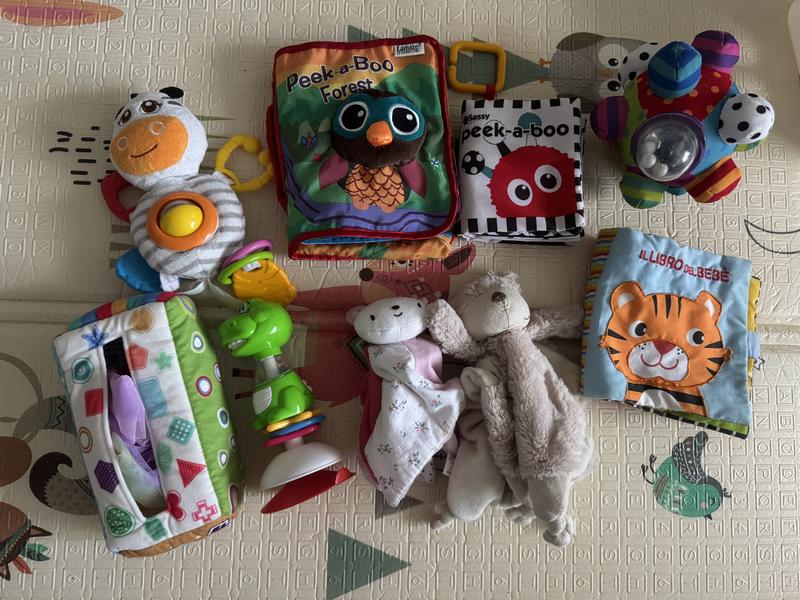Продам іграшки для малючка: 1. Мʼяка іграшка брязкальце Carters шар -150грн 2. Контрастна книга Sassy - 150 грн 3. Кольорова книжечка більших розмірів - 50грн 4. Іграшка-брязкальце chicco Жираф - 150грн 5. Брязкальце Bebelino Динозавр на присосці торохкотить при обертанні - 80грн 6. Серветниця - улюблена іграшка супер для дрібної моторики - 160 7. Комфортери - рожевий 40 грн, беж від бренду mamas&papas 100 грн 8. Сенсорна книга lamaze (окреме фото не влізло, є на головному) - 150