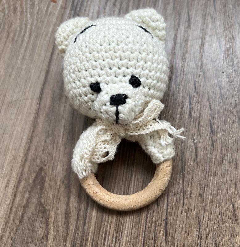 Брязкальце з гризунком прорізувач гризунець з деревʼяним кільцем вʼязане ведмедик