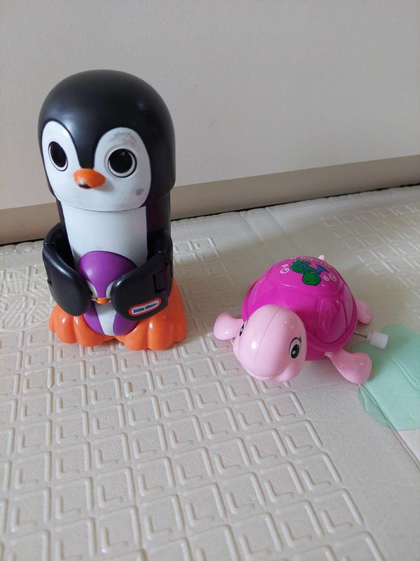 одна игрушка бренда Little Tikes, она механическая, нажимаешь на голову она едет и открывает лапки, видно малыша, есть потертости, не влияет на игру - потому что пластик хорошего качества неубивающий))) другая простая себе заводная черепашка. цена за комплект