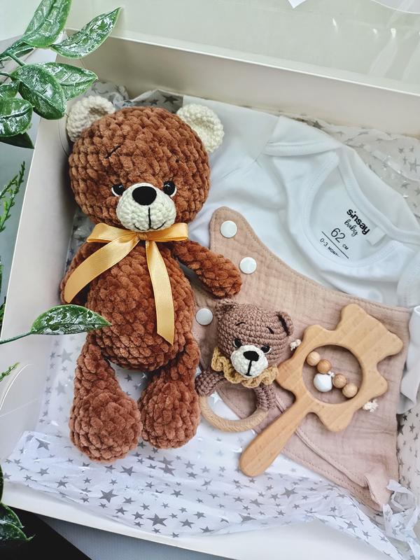 Бейбибокс детский набор в состав которого входит: ✅вязаный плюшевый мишка 24 см; ✅погремушка-грызунок деревянная; ✅погремушка на деревянном кольце вязаная; ✅муслиновый слюнявчик на кнопках; ✅бодик с коротким рукавом на рост 62 см. 🎁подарочная упаковка. Можно менять по желанию наполнения бокса добавлять или убирать какие-то из предметов. Цвет мишки тоже можно выбрать. 🎁Идеальный подарок на babyshower, гендерпати, выписку, семьи, крестины и т.д. Можно использовать для красивых фотосессий или чтобы оповестить самых редких о предстоящем радостном событии🫄🧑🍼 Не нужно ничего искать, все уже собрано в бокс😊 📝Пишите чтобы уточнить детали перед заказом, отвечая очень быстро. Подписывайтесь чтобы не потерять и хороших вам покупок💕