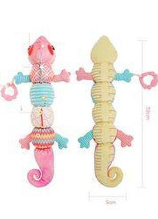 Розвиваюча м’яка іграшка для найменших дітлахів. Виконана у вигляді кольорового хамелеона, який приготував дитині безліч цікавих забавок: пискавку, дзвіночок, шелесткі елементи та гумовий прорізувач, який значно полегшить стан малюка під час прорізання зубів. Зі зворотньої сторони іграшка має ростомір, який допоможе батькам відстежувати розвиток дитини. Особливості: - виконана у вигляді хамелеона; - створена для найменших малюків; - всередині іграшки дзвіночок, пискавка та шелесткі елементи; - гумовий прорізувач; - ростомір зі зворотної сторони іграшки; - довжина - 59 см; - виконана з приємного на дотик текстилю.