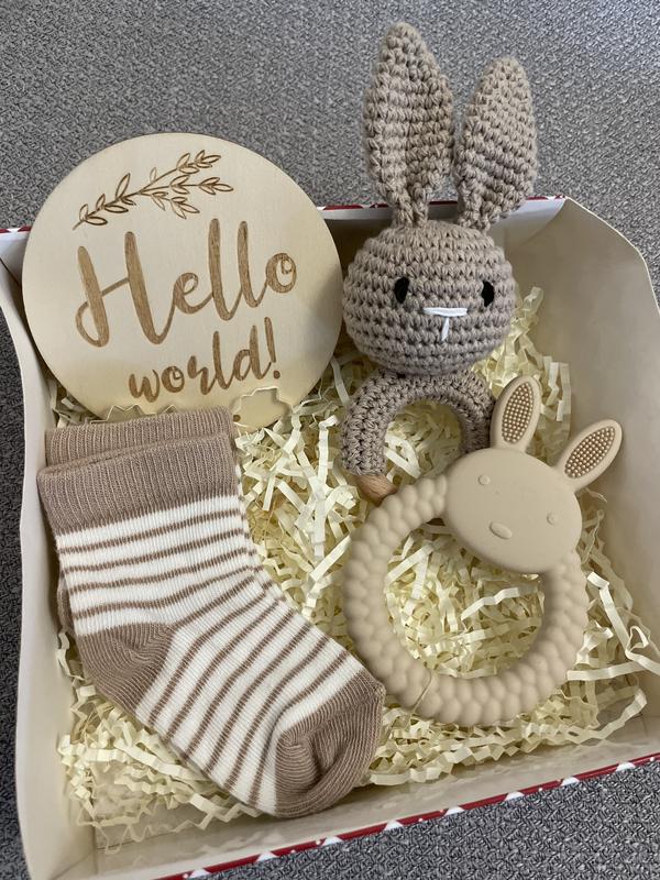 До набору входять: 1. Силіконовий гризунець «зайчик» 2. Вʼязане брязкальце ручної роботи «зайчик» 3. Шкарпетки next 4.Картка для фотосесії Досі шукаєте ідеальний подарунок молодим батькам? Ми його вже підготували! Деталі боксу можна змінювати за Вашим бажанням