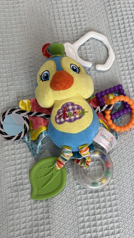 Яскраві кольори, шарудливі елементи, різноманітна текстура матеріалу, познайомлять дитину з поняттям "форма" , "колір" і " звук " Додатково закріплений прорізувач на іграшці допоможе дитині зменшити свербіж від зростаючих зубиків. Розвиваюча іграшка виготовлена з якісного текстилю, не містить шкідливих речовин абсолютно безпечна для дитячого здоров'я. Натиснувши на тільце тваринки вона запищить. Можна закріпити до ліжечка, візочка, автокрісла...
