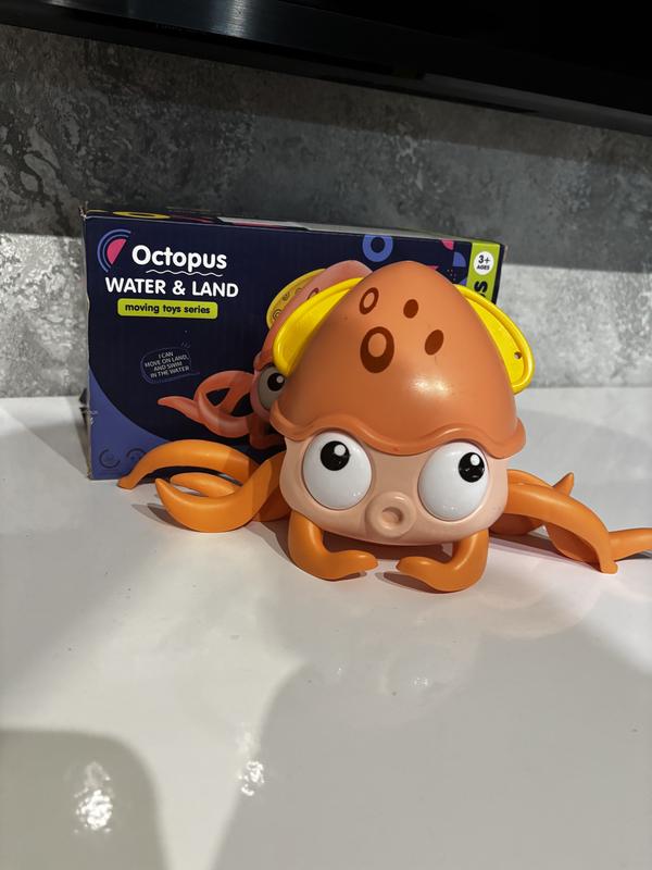 Іграшка заводна "Восьминіг" оснащена заводним механізмом. Грати цією іграшкою можна і у воді, і на суші. Для запуску поверніть механізм на спинці іграшки і восьминіг поповзе або попливе. Також прив'язавши за мотузку, яка в комплекті, можна тягнути восьминіжку за собою, і він смішно перебирати лапками. Не потребує батарейки. Для дітей старше 2-х років. Видно незначні потертості, але в використанні майже не була