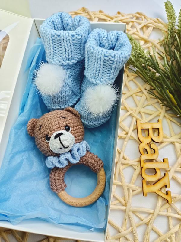 Предлагаю небольшой набор для малыша в который входят вязаные пинеточки ручной работы украшены натуральным мехом и погремушка на деревянном кольце мишка. Материал полухлопок. Длина пинеток 8 см, могут быть выполнены в любом цвете. Есть разные цвета, смотрите Мои другие объявления. 📝Пишите чтобы уточнить детали предшествующим оформлением заказа, отвечая очень быстро. Подписывайтесь, чтобы не потерять у меня много интересных оригинальных товаров и красивых вам покупок💕