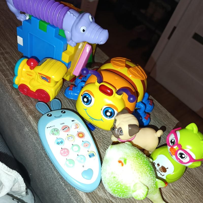 Набор игрушек для младенцев. Телефончик музыкальный,все кнопочки работают, проигрывает музыка, животные,песечки. Пчелка тоже музыкальная и двигает ножками, самая походная по полу☺️👍
