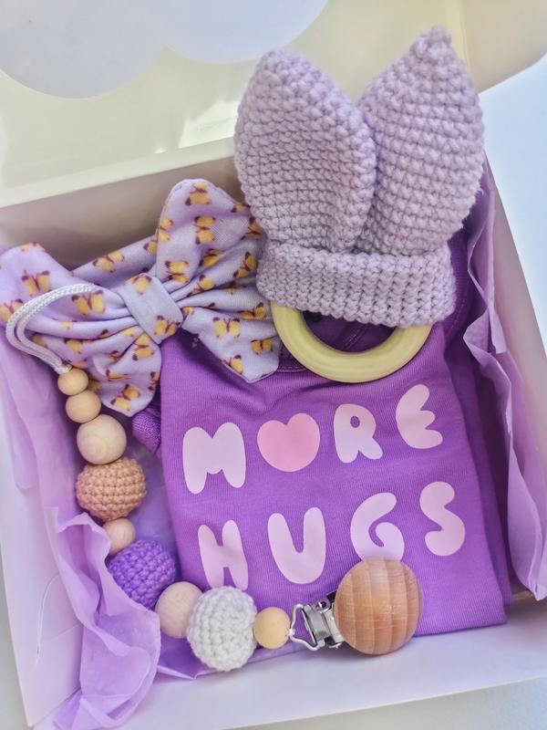 🪻В состав набора входят: ✅человечек с длинным рукавом на рост 56 см(1-3 мес) с принтом "Больше объятий" ✅грызунок вязаный ушки (шардут при сжатии) на деревянном кольце ✅ повязка на голову с бантиком ✅держатель для соски/грызунки с деревянной клипсой 🎁упаковка в красивую подарочную коробочку 📝Пишите чтобы уточнить детали предшествующим оформлением заказа, отвечая очень быстро. Подписывайтесь чтобы не потерять и хороших вам покупок💕