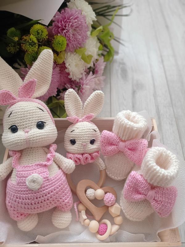 Подарунковий набір для новонародженої дівчинки - ідеальний подарунок до народження дитинки чи на Хрестини. 100% ручна робота, зв'язаний з якісної дитячої пряжі (всі матеріали гіпоалергенної, деталі іграшок на безпечному кріпленні). До набору входить: брязкальце зайчик, буковий гризунець, іграшка зайчик (одяг з'ємний) та пінетки.