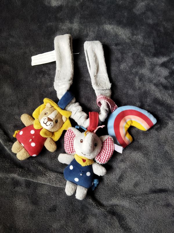 Іграшка на коляску, велюр. Застібається на липучках, тримається міцно, можна чіпляти з обох сторін,можна одною. Іграшки розвиваючі, 🌈- шуршить, 🦁-пікає, 🐘-калатає. Дуже крута річ,нам трохи пізно подарували, майже не користувались.