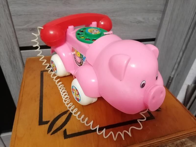 Размер 26 см х 15 см х 14 см. Когда едет свинка открывает рот и пищит. Когда крутить цифры тоже есть звук. Отправка по укрпошту или новой почте. Оплата на карту или через безопасную оплату.