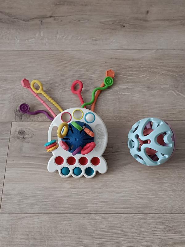 1. Игрушка от Qunxing Toys, развивающий комплекс: 6 щупалец-красов, грызунов разных цветов и фактур из силикона. 3 пластиковых кольца разных цветов с рифленой поверхностью; симпл-димпл на корпусе игрушки. 2. Игрушка-погремушка Bambinelli Шарик.