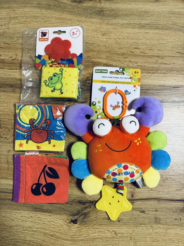 М'яка багатофункціональна іграшка-прорізувач Baby team, 4+. Іграшка на коляску, погремушка, мʼяка іграшка. Нова, запакована. Додам фото з сайту. Також три мʼякі книжечки. Дві з них нові запаковані, однією користуватись. Все одним лотом - 155 грн.