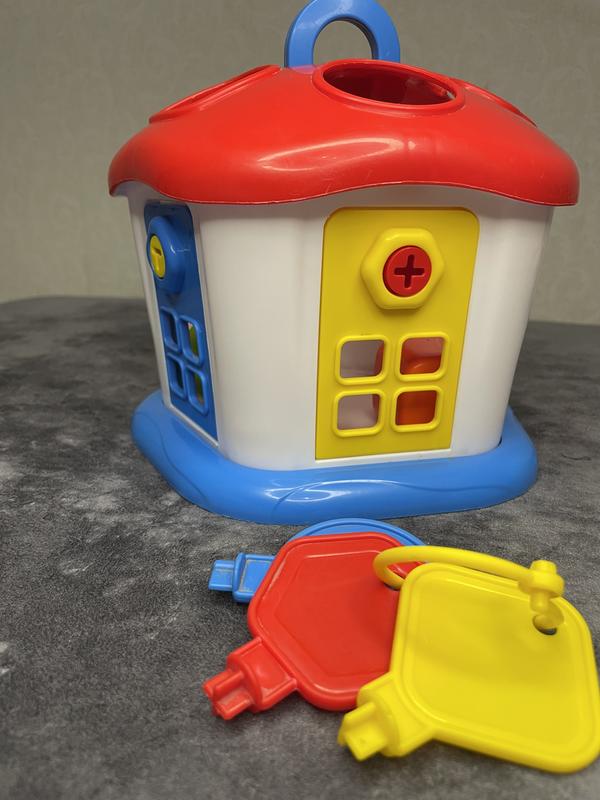 Іграшка-сортер Dolu Shape Sorter Sweet House з дверцятами, що замикаються. Іграшка яскравих кольорів має форму будиночка з п'ятьма отворами для фігур. Вона оснащена трьома дверцятами, які можна відчиняти та зачиняти за допомогою великих ключів. Ця іграшка допомагає дітям вивчати кольори та форми, а також розвиває координацію рук і очей, дрібну моторику та навички вирішення проблем. Рекомендований вік для використання — від 12 місяців.
