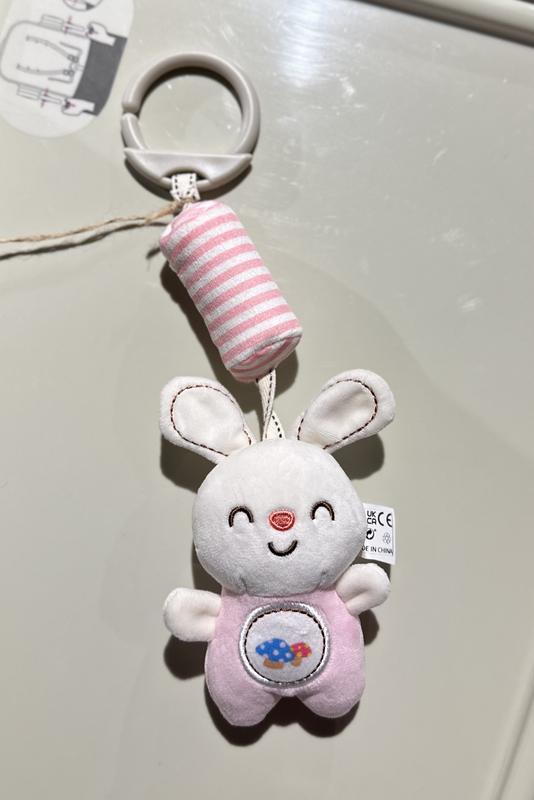 Іграшка підвіска на коляску або авторкісло у формі рожевого зайчика. приємне брязкання для заспокоювання малечі. Вушка шарудять, в животику пищалка.