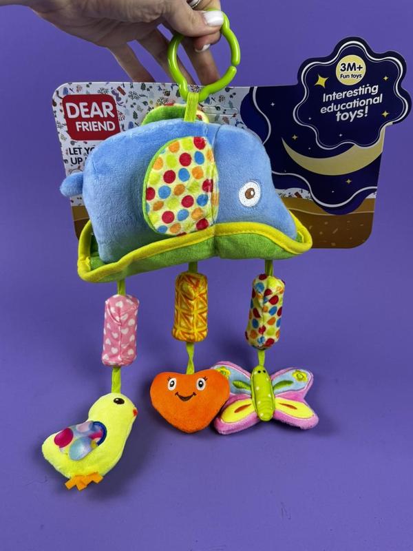 М'яке брязкальце у вигляді слоника -- справжня знахідка для турботливих батьків! Воно має шелесткі елементи, веселу пискавку та створює ніжну мелодію вітру, що заспокоює та розвиває слух малюка. Завдяки зручному кріпленню іграшку легко причепити над ліжечком, у візочку чи автокріслі. Ідеальне поєднання гри та розвитку сенсорних навичок з перших днів життя! Особливості: - розмір іграшки: 21*42 см; - іграшку виконано у вигляді милого слоника; - брязкальце виготовлене з текстилю, м'яке та приємне на дотик; - мелодія вітру; - пискавка; - шелесткі елементи; - розвиток сенсорики, моторики, слуху та координації рухів малечі; - кріплення для підвішування іграшки. * Характеристики та комплектація товару можуть змінюватися виробником без повідомлення