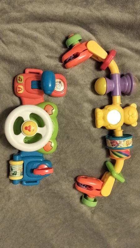 руль на коляску и дуга на коляску в хорошем состоянии руль работает от батареек светятся лампочки, разные звуки музыка. на дуге пикует при нажатии, есть зеркальце, все прокручивается. размер дуги-50см максимум, минимум 33/35см руль -15*35см