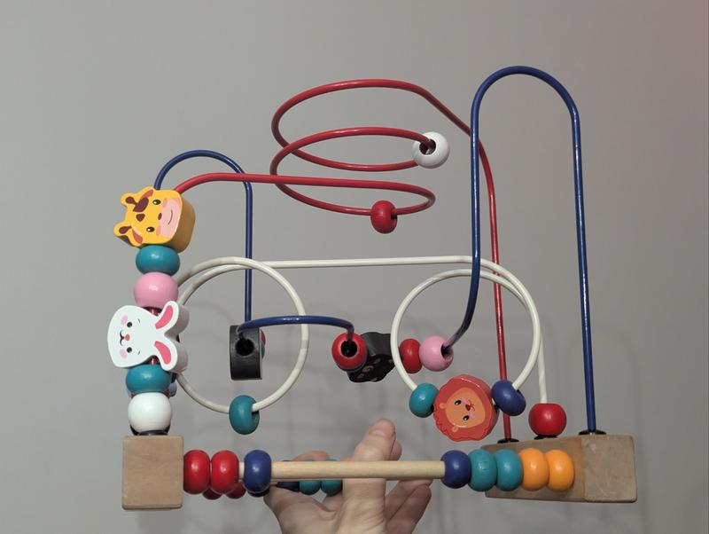 Игрушка в очень хорошем состоянии, близка к идеалу. Была интересна малышу от 6 до 18 месяцев. кроме бусинок, там разные зверюшки. Материалы: дерево, металл.