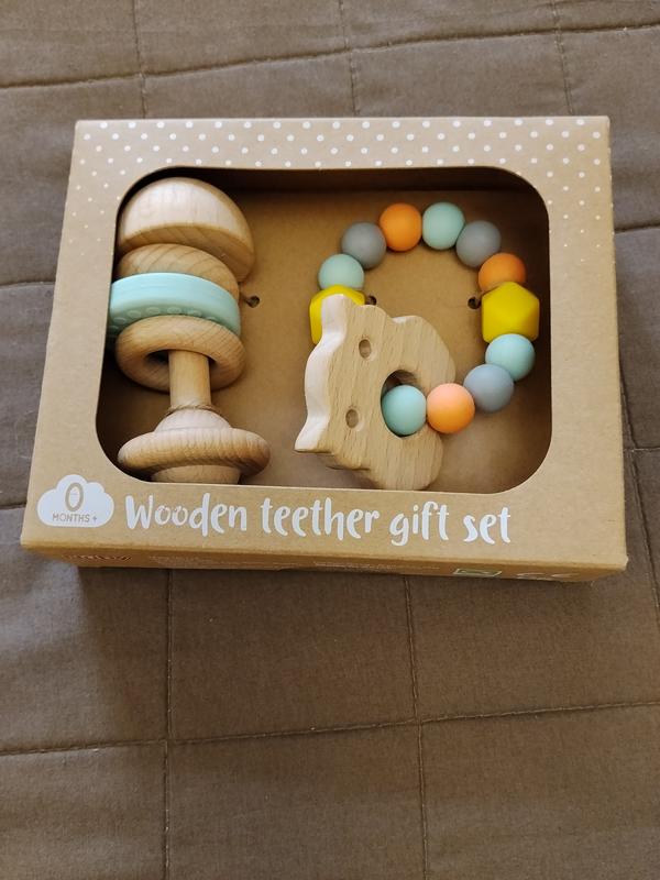 подарочный набор деревянных прорезывателей для зубов от бренда Nuby. Он предназначен для облегчения прорезывания зубов у младенцев. Набор включает два отдельных прорезывателя: один в форме погремушки, другой - кольцо с силиконовыми и деревянными элементами. Изготовлены из комбинации натурального дерева и мягкого силикона, обеспечивающего различные текстуры для исследования ребенком. Деревянные прорезыватели считаются безопасными, если они изготовлены из высококачественной, нетоксичной древесины. Продукт подходит для младенцев от 0 месяцев, как указано на упаковке