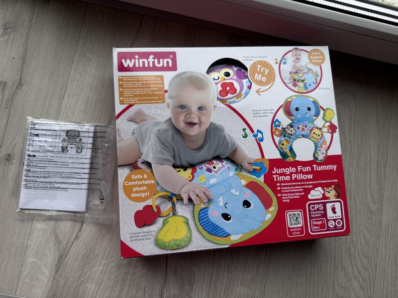 Подушка для немовляти WinFun — це м’який та безпечний помічник для перших етапів розвитку дитини. Вона створена у формі півмісяця, що забезпечує комфортну підтримку під час ігор на животику, перших спроб підніматися та сидіти. Подушка оснащена різними інтерактивними елементами: веселими мелодіями, що запускаються легким натисканням кнопки, доброзичливим слоником із шарудким наповненням, брязкальцями та пищалкою. Прорізувач, який також входить до комплекту, допомагає заспокоїти ясна під час прорізування зубів. Знімна музична скринька дозволяє прати подушку в пральній машині, а аксесуари можна легко від’єднувати та брати із собою для розваг. Майже не використовували, всі елементи цілі, механізм працює, збережена коробка. Можливий самовивіз із центра Дніпра.