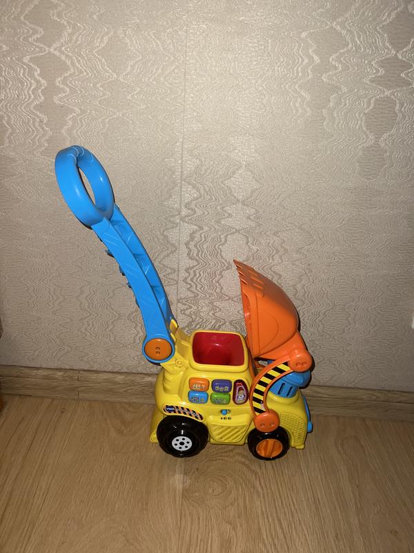 Каталка VTech Бульдозер Бульдозер англ. мова Малюку буде зручно штовхати бульдозер за ручку , щоб котити його по підлозі і спостерігати за тим , як кульки вискакують з труби в ковш і потім знову закидаються в бульдозер Збоку є кнопочки для вивчення кольору , цифр , фраз і музики Під час гри , дитина чує веселі мелодії і пісні , розвиваючи увагу і координацію