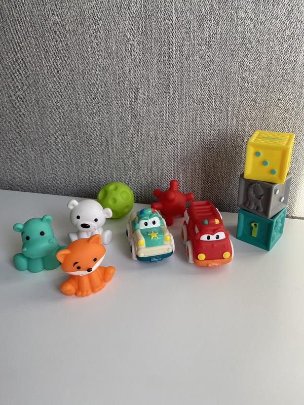 Продам оригінальний набір іграшок Infantino для малюка. Яскраві, цікаві, добре підходять для розвитку дрібної моторики та сенсорного сприйняття. У наборі: • машинки • фігурки тварин • кубики • мʼячі Іграшки міцні, безпечні, приємні на дотик. Стан гарний, всі цілі, без тріщин. Підійде для дітей від 6 місяців. Продаю набором. Відправлю Новою поштою або Укрпоштою.