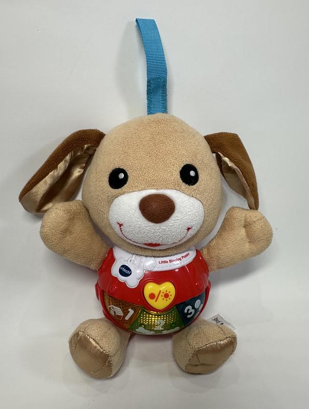 Інтерактивна іграшка VTech Little Singing Puppy. Містить три світлові кнопки, які допомагають вивчати цифри, почуття та фрази. Включає 3 пісні та 15 мелодій із веселими звуковими ефектами. М'який корпус сприяє тактильній стимуляції, а натискання кнопок розвиває дрібну моторику. Можна прикріпити до коляски чи автокрісла.
