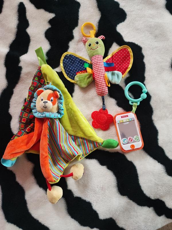 Цена за все все очень качественное Игрушка комфортер Лев - состояние нового Музыкальная погремушка смартфон - идеальное, всё работает Погремушка палочка бабочка - хорошее , немного оторвалась одна лапка можно подшить
