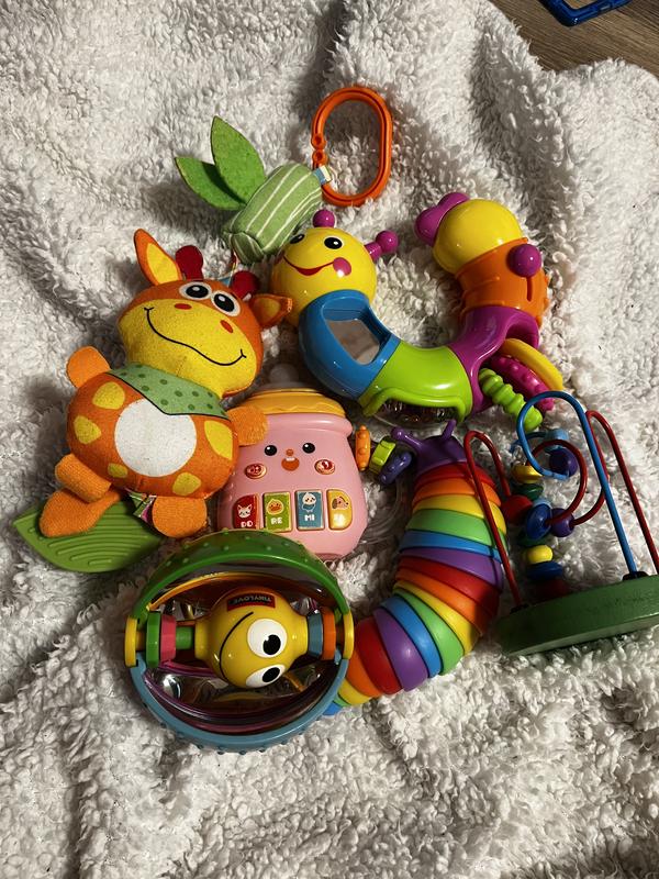 Набір іграшок для дитини від народження, стан 9/10, користувалися дуже мало. Всі іграшки різні для розвитку різних функцій. Фото 2 Іграшка брязкальце Гусениця із дзеркалом Складається з шести обертових секцій, що розвивають дрібну моторику. Оснащена дзеркальцем та звуковими ефектами при струшуванні. Має еластичні елементи для розвитку сили ручок. Фото 3 Брязкальце-м'яч Tiny Love "Веселка на галявині". Містить рухливі зовнішні елементи з пухирчастою поверхнею для розвитку тактильних відчуттів. Всередині знаходяться дзеркальні поверхні, які привертають увагу малюка. Сприяє емоційному та фізичному розвитку дитини. Фото 4 Іграшка-антистрес у формі різнокольорового слимака. Гнучка конструкція, що складається з багатьох сегментів, які рухаються . Фото 5 Дерев'яна іграшка-лабіринт на дроті. Розвиток дрібної моторики, координації рухів та логічного мислення у дітей. Фото 6 Підвісна іграшка-брязкальце для немовлят у формі жирафа. Іграшка має брязкальце, яке видає звуки при струшуванні, та прорізувач для зубів у формі зеленого листка. Фото 7 Музична пляшечка - багатофункціональна розвиваюча іграшка українською мовою, яка поєднує функції брязкальця, прорізувача та музичного центру. Іграшка підсвічується, відтворює пісні, казки, вірші, звуки тварин та ноти. Продаж одним лотом