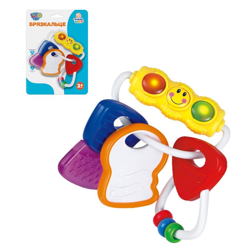 Погремушка-прорезыватель. Ключики отлично подходят для маленьких ручек. Выпуклые орнаменты на ключах дают различные тактильные ощущения, и помогают малышу справиться с периодом появления первых зубов. При нажатии на улыбчивую мордашку мигают огоньки. Разноцветные колечки удобно вращать, развивая мелкую моторику рук. Особенности: массирует десны световые эффекты развивает восприятие цвета развивает тактильные ощущения Элементы питания: 3 батарейки типа AG13 1.5V (входят в комплект)