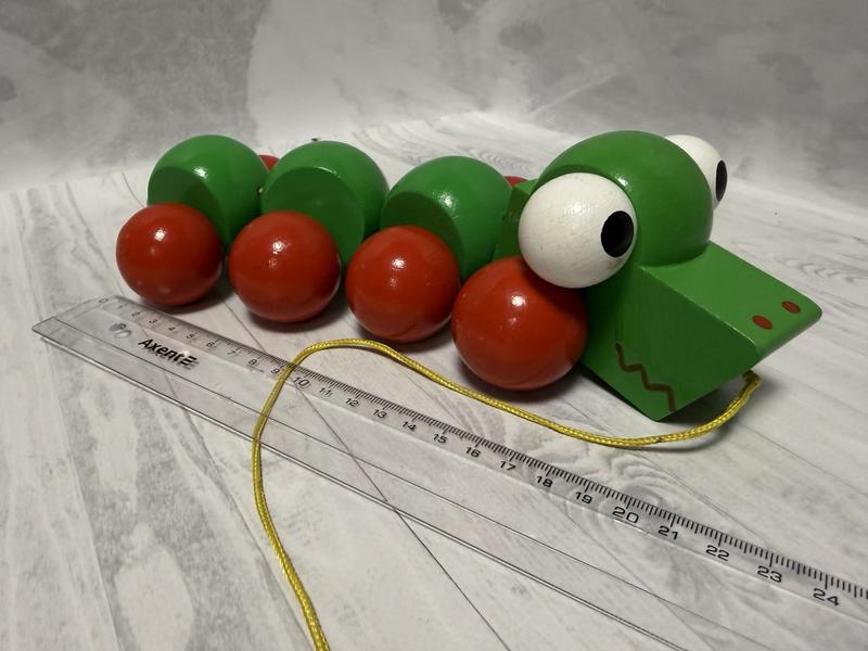 Натуральное дерево с цветным покрытием. Игрушка имеет веревку для тягивания, а при движении глаза крокодила вращаются. Стан нового.