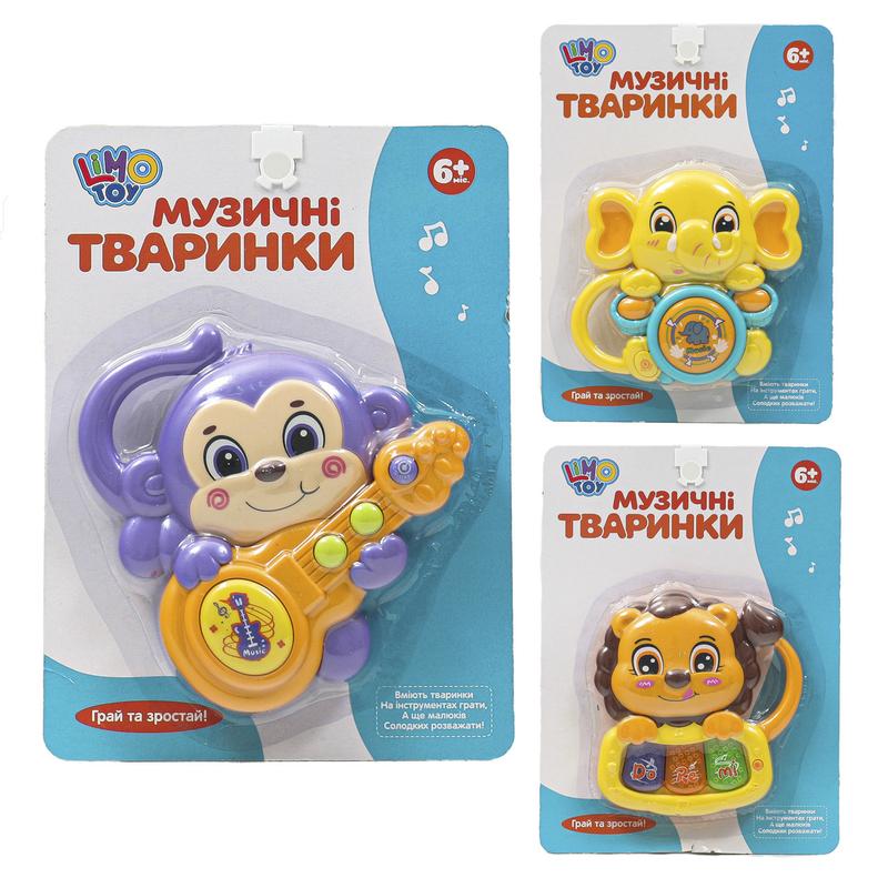 Брязкальце "Музичні тваринки", різні види. Звукові та світлові ефекти. Живлення - батарейка. Паковання — лист. Розмір - 16,5х2,5х22,5 см