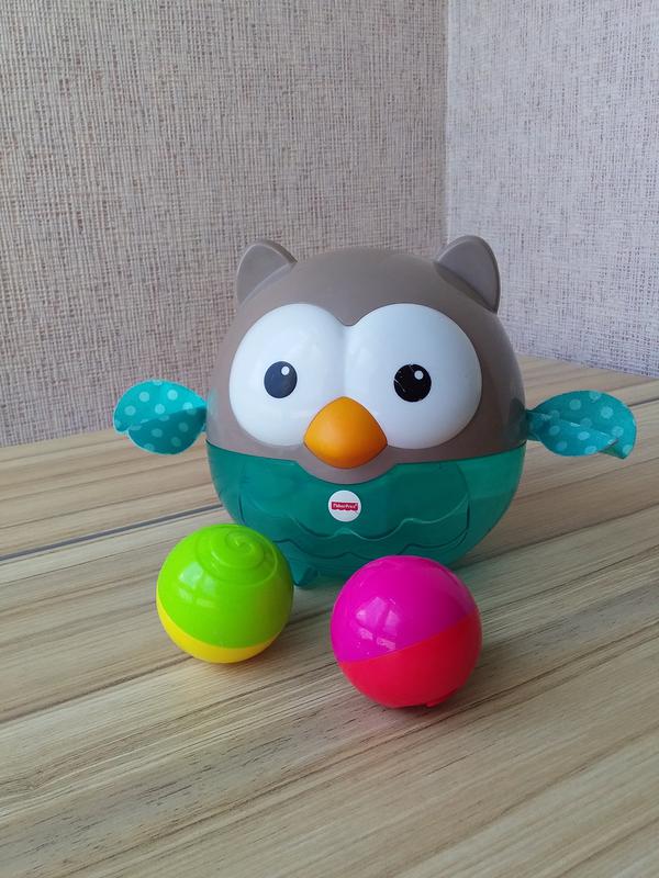 Fisher-Price Сова з кульками. Сова з трьома кольоровими кульками є чудовою іграшкою для малюків. Усередину совеняти можна покласти кольорові кульки — це розвиватиме моторику й сенсорні навички, а приємні на дотик сатинові крила заспокоять дитину й допоможуть розвивати тактильне сприйняття навколишнього світу. В комплекті тільки 2 з 3 кульок Стан: має потертості на прозорому пластику та на очках Ціна: 130 грн