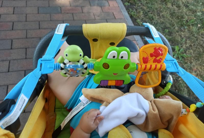 Игрушка для коляски и автокресла Bright Starts развлечет в поездке вашего малыша. очень легко вращается и крепко можно закрепить Очень хорошо держат липучки. Особенности: - центральная интерактивная игрушка-жабка, нажатие на глазки которые активирует световые эффекты и 4 мелодии - вращающаяся погремушка-черепаха привлечет внимание малыша бегающими разноцветными шариками внутри - вращающееся безопасное зеркало - универсальное крепление-липучки - развивает мультисенсорное восприятие и мелкую моторику ребенка. Качество супер.