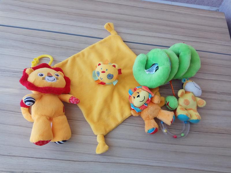 Набір іграшок Mothercare для малюків 1) Спіралька на ліжечко чи коляску Mothercare. Усередині іграшок брязкальця. 2) М'яка підвіска Лев Mothercare. Усередині лева брязкальце, лапки і грива шелестить, в попі гранули. Висота: 20 см 3) Комфортер для малюків, дуже приємний на дотик. Стан дуже хороший Ціна: 200 грн набір