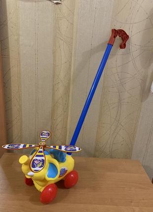 Каталка «Слоник» со звоночком и ручкой. Яркая, устойчивая каталка с моргающими глазками и вращающимися лопастями сверху. Размер каталки: 21*16*18 см. Длина палочки: 52 см. Высота от пола до ручки: 53.5 см. Возраст: 1+ Игрушка новая.