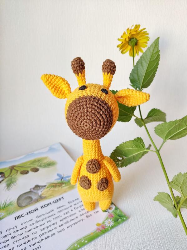 Кумедний малюк Жираф - володіє особливою аурою і дарує своєму власникові позитив та тепло. Він неодмінно стане надійним другом вашого малюка. Стоїть з опорою. Усі деталі вив'язані і надійно пришиті. Відсутні дрібні та гострі деталі. Догляд: ручне прання 30 град., обробка парою. Термін виготовлення 4 робочих дня. За потреби виготовимо в іншому кольорі. ХАРАКТЕРИСТИКИ Зріст 21-23 см; Матеріл: - напібавовнянна пряжа - безпечна для вашої дитини, не викликає алергіних реацій, не линяє після прання і не має ворсу; - холлофайбер - наповнювач, який відрізняється більш щільною структурою ніж синтепон, не викликає алергічних реакцій.