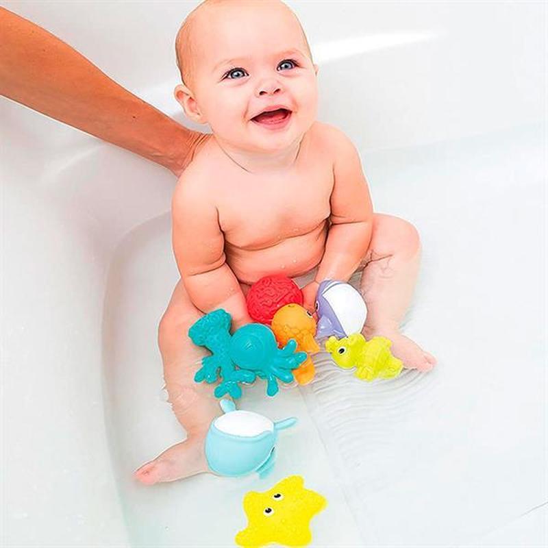 Набір іграшок для ванної Infantino Морські друзі в тубусі складається з 8 предметів - кольорових текстурних фігурок жителів морського світу. Немовлята будуть в захваті від цих яскравих іграшок. Ідеально підходить для сенсорного розвитку та веселої гри у ванній кімнаті. Також малюк познайомиться з морськими тваринками. Підходить для хлопчиків і дівчаток від народження.