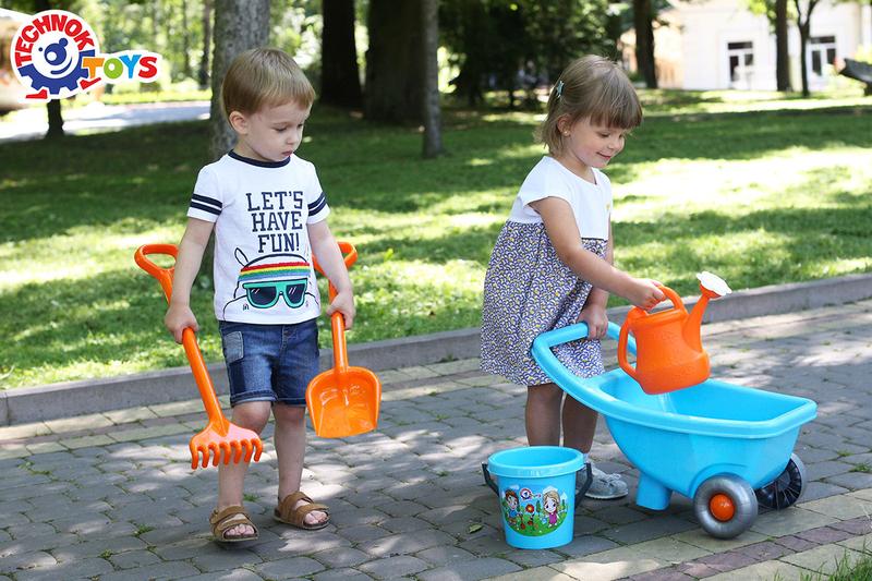 2418 Основой набора является голубая тачка с двумя прочными колесами и ножкой. Конструкция делает ее устойчивой к перекиданиям на поворотах, спусках или подъемах. Широкая ручка позволяет ребенку тянуть тачку двумя или одной рукой. В тачке можно перевозить яблочка, собранные в саду, листья, песок или даже своих игрушечных друзей). Яркая лейка, с двумя ручками является удобной для малышей – с помощью одной легко переносить лейку с водой, а держа за обе – поливать цветник. Лопатка и грабельки будут полезны осенью, когда нужно собирать сухие листья. Ведерко с яркой наклейкой – необходимый атрибут для каждого садовода и игр в песочнице. Играя в садовника, ребенок учится заботе о деревьях и цветах. Такие игры прививают любовь к природе, развивают воображение, фантазию и творческое мышление. А время проведенное с родителями на свежем воздухе – неоценимо. Все элементы набора изготовлены из прочного качественного пластика, без запаха. В наборе: тачка, лейка, ведерко, лопата и грабли