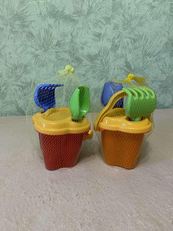 Песочный набор. Украинский производитель.Прочный, яркие цвета, красивые пасочки. Комплектация: -ведро -лопатка -грабельки -ситечко -3 пасочки Размеры: ведро 15*13 см.; лопатка и грабли 19 см. Наборы новые.