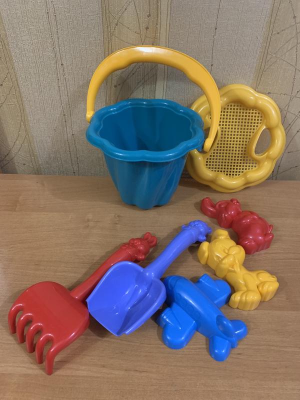 Песочный набор. Украинский производитель: Colorplast. Прочный, яркие цвета, красивые пасочки. Комплектация: -ведро -лопатка -грабельки -ситечко -3 пасочки Размер ведёрка: 16*13 см. ; лопатка и грабли 19 см. Наборы новые.