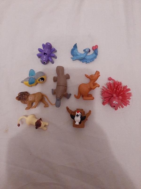 Набор животных/ фигурки из киндера🔥 Цена за набор (всё что на фото) В набор входит: 1. Дятел с деревцем (отсоеденяется от дерева) 2. Попугай 3. Утконос 4. Кенгуру 5. Пчёлка 6. Львица 7. Лев 8. Паук Кусачка 9. Ёжик