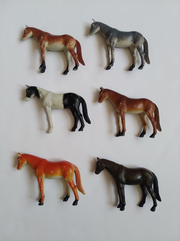В очень хорошем состоянии, кроме одной серой лошадки, у нее одно ухо повреждено. Цена в объявлении указана за все 6 шт, за лот.