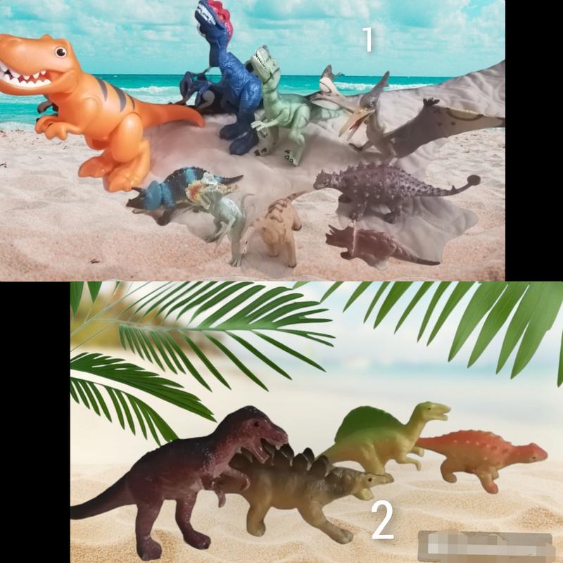 Номер 1- у всех динозавров шевелятся лапы, рот, один динозавр на батарейках звуковые эффекты. Цена за весь набор 220грн. Номер 2 цена за набор 60