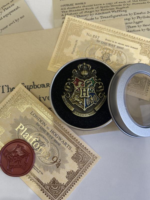 Брошь Гарри Поттер в подарочной жестяной коробочке, с письмом где прилагается: Приглашение в Хогвартс, перечень Инвентаря что иметь при себе! Золотой билет на экспресс платформа 9-3/4 В наличии Брошь:SLYTHERIN-GRYFFINDOR-HOGWARTS