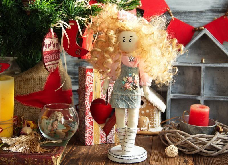 Кудрявое счастье) Детали. Интерьерная кукла в наличии и ищет семью. Рост - 33 см. С подставки снимается, ручками шевелит, прическу делать позволяет, любит ласку и на ночь сказку. Хочет найти любящее сердечко) . Упаковка - фирменный крафт пакет от Теплого уголка