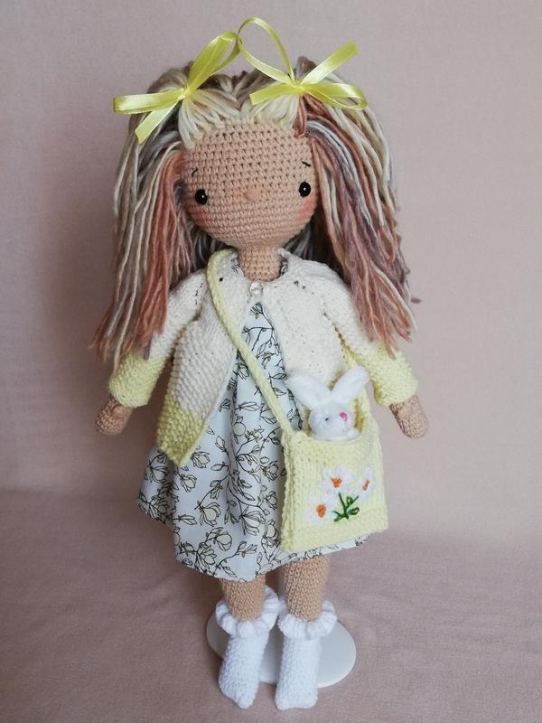 Продана.Весняна лялечка, ігрова, одяг знімається. У лялечки є сумочка з вишивкою, в якій сидить її друг-зайчик. У лялечки ніжки згинаються в колінах, може сидіти. Виконана з пряжі YarnArt jeans, сукня з бавовни. Лялечка призначена повністю для гри. Така милашка буде гарним подарунком для дівчат)) Повтор по кольору одягу та волосся неможлива.